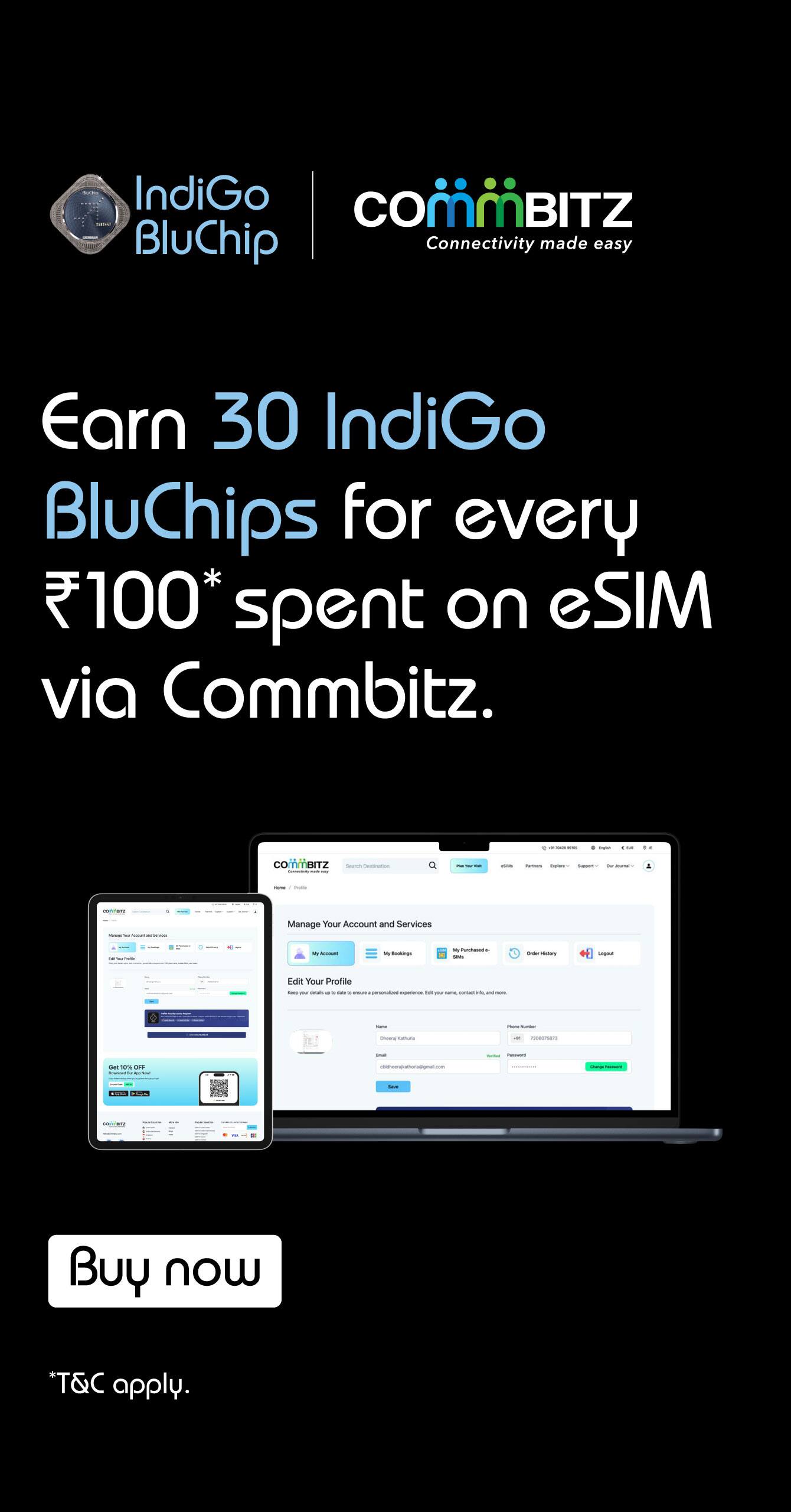 This partnership allows IndiGo BluChip Members to earn IndiGo BluChips on purchases of eligible Commbitz eSIM services.