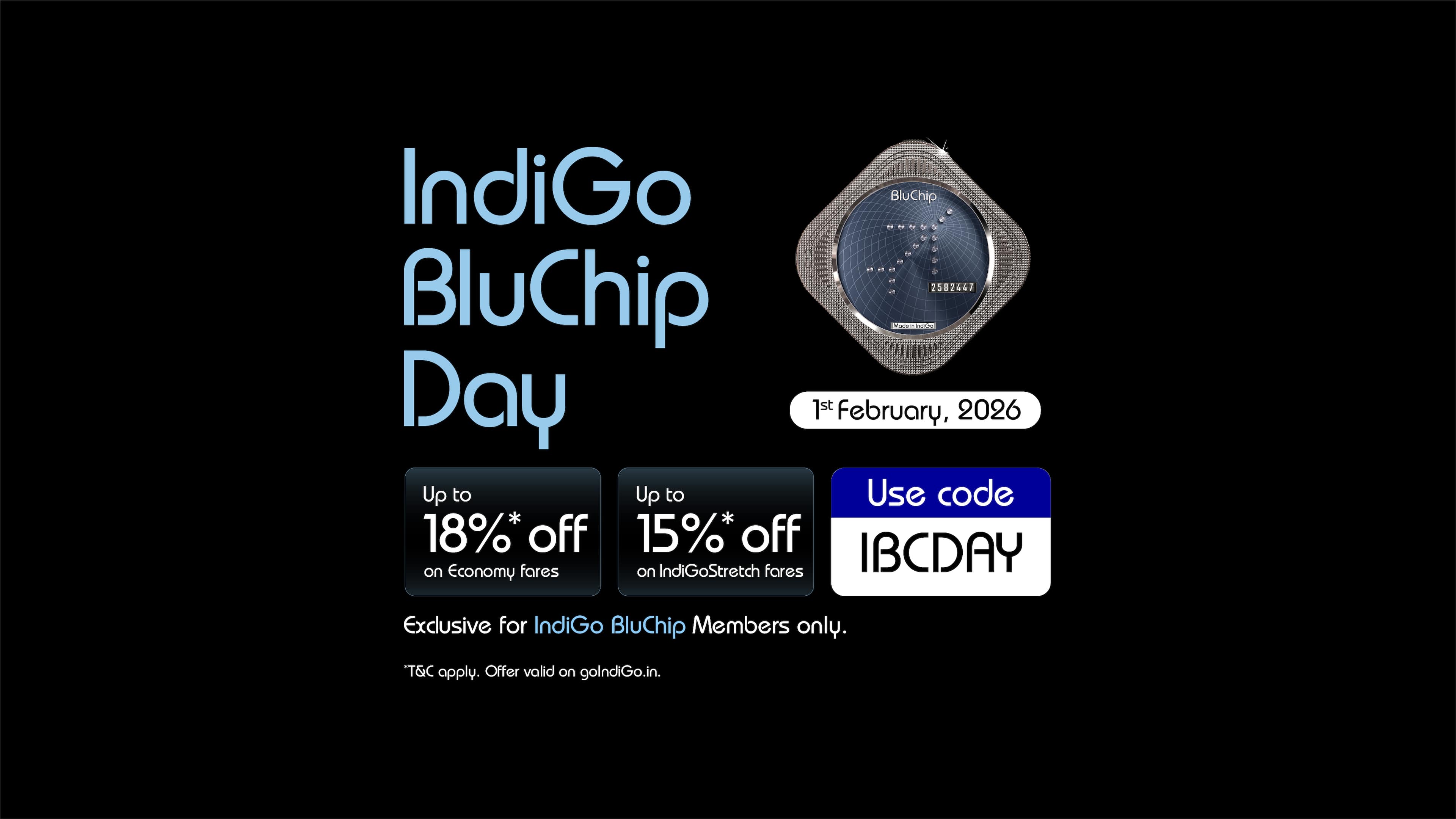 - InterGlobe Aviation Limited (“IndiGo”), offers to its IndiGo BluChip Members discounted fares and Add-Ons on select domestic and select international sectors for flight bookings made through IndiGo website (goindigo.in) or IndiGo mobile app (Android or iOS). This offer is valid on February 01, 2026, from 00:01 hours up to 23:59 hours IST (“Offer Period”) for travel scheduled between February 07, 2026 till April 30, 2026 (“Offer”).