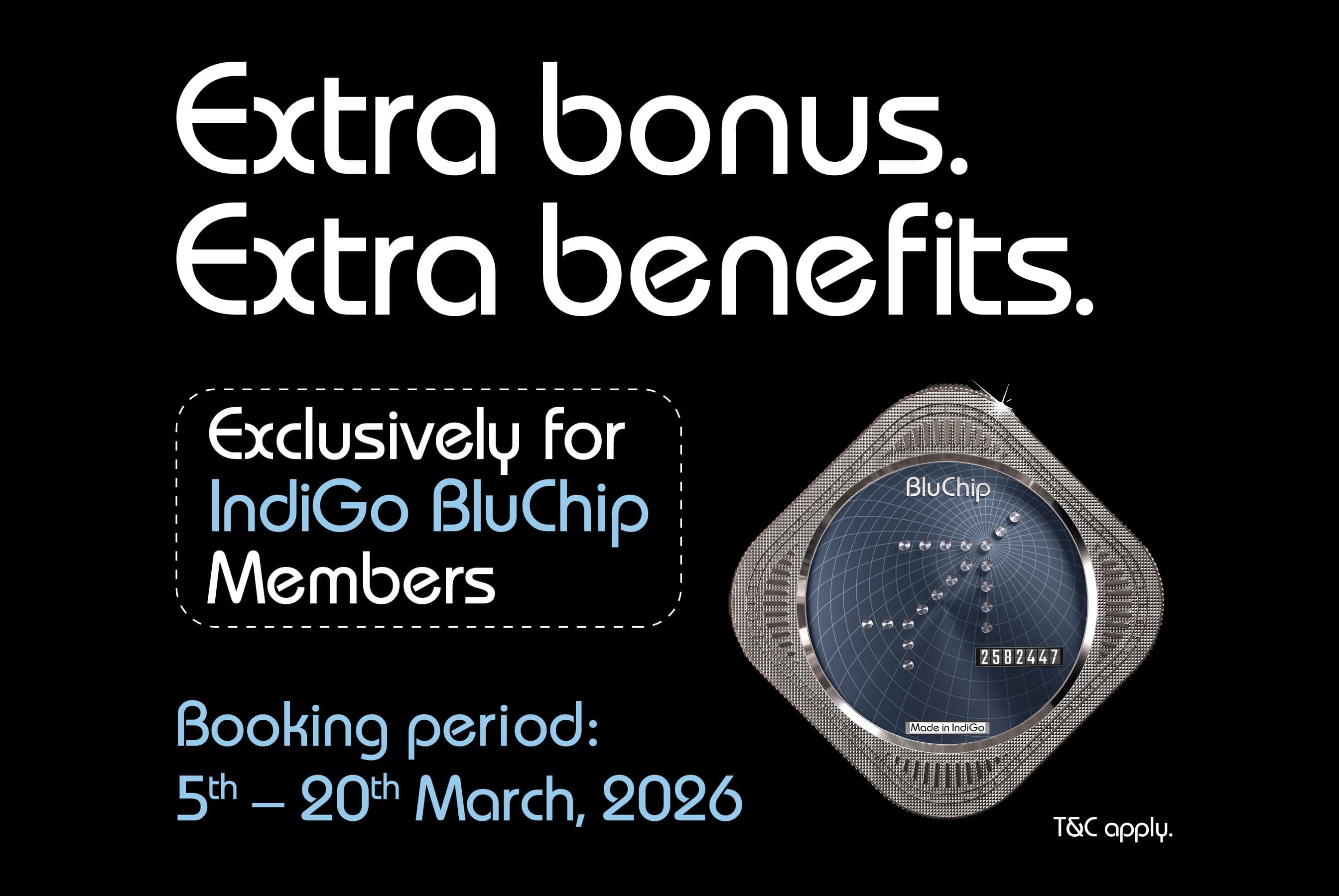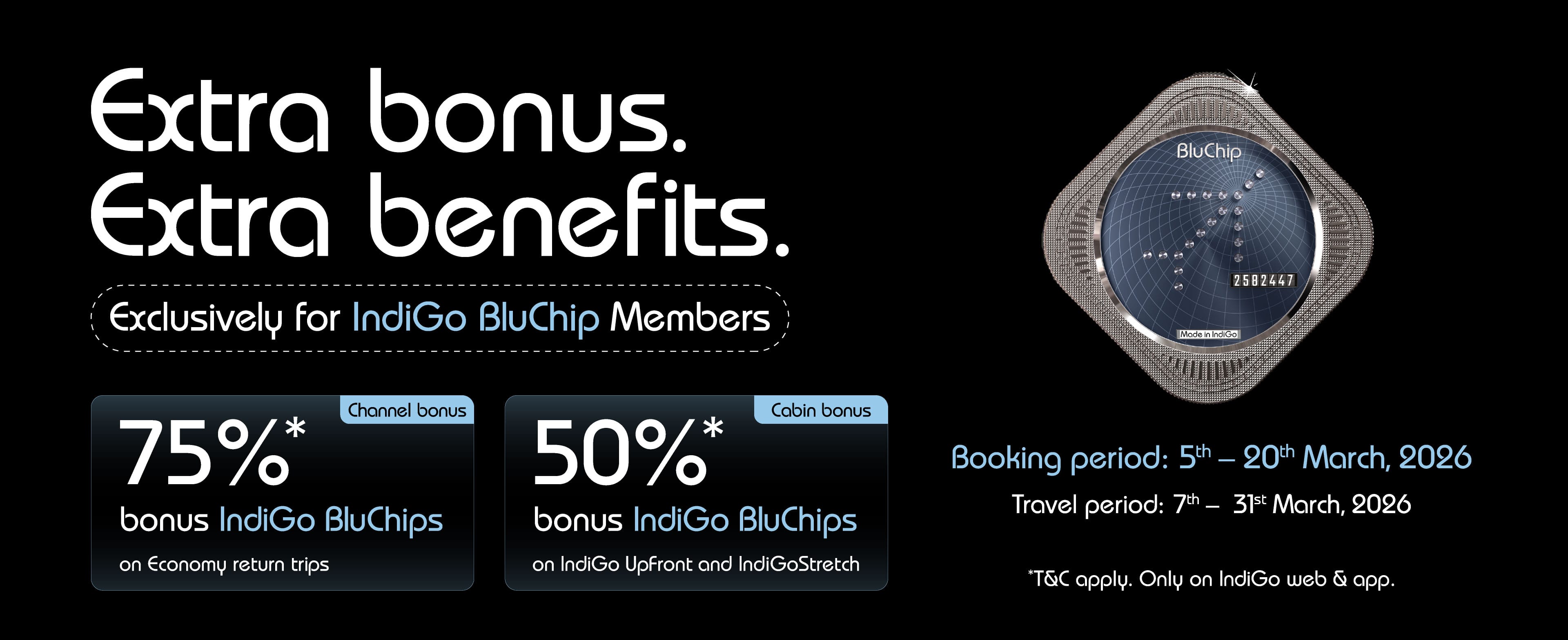 - InterGlobe Aviation Limited (“IndiGo”), offers to the members of IndiGo BluChip Program (“IndiGo BluChip Members”), additional Bonus IndiGo BluChips on select domestic and select international sectors for flight bookings made through IndiGo website (www.goindigo.in) or IndiGo mobile app (Android or iOS) or 6Eskai, in accordance with the terms and conditions set forth hereunder. This offer is valid from 00:01 hours, March 5th, 2026, to 23:59 hours, March 20th, 2026, (“Offer Period”) for travel scheduled between March 7th, 2026 and March 31st, 2026 (“Travel Period”) (“Offer”).