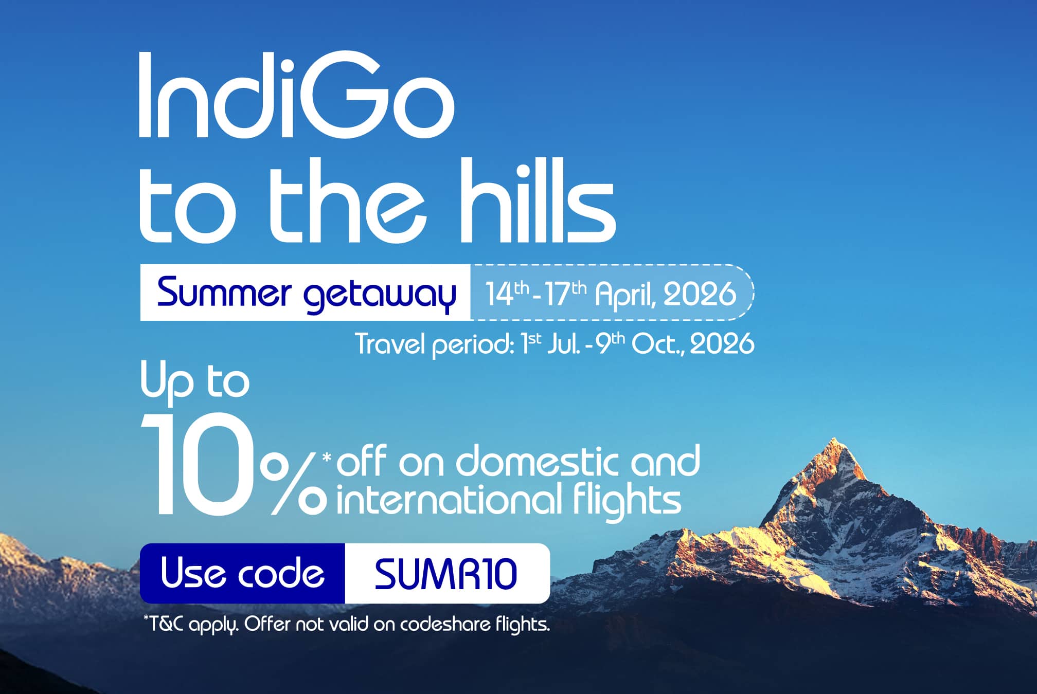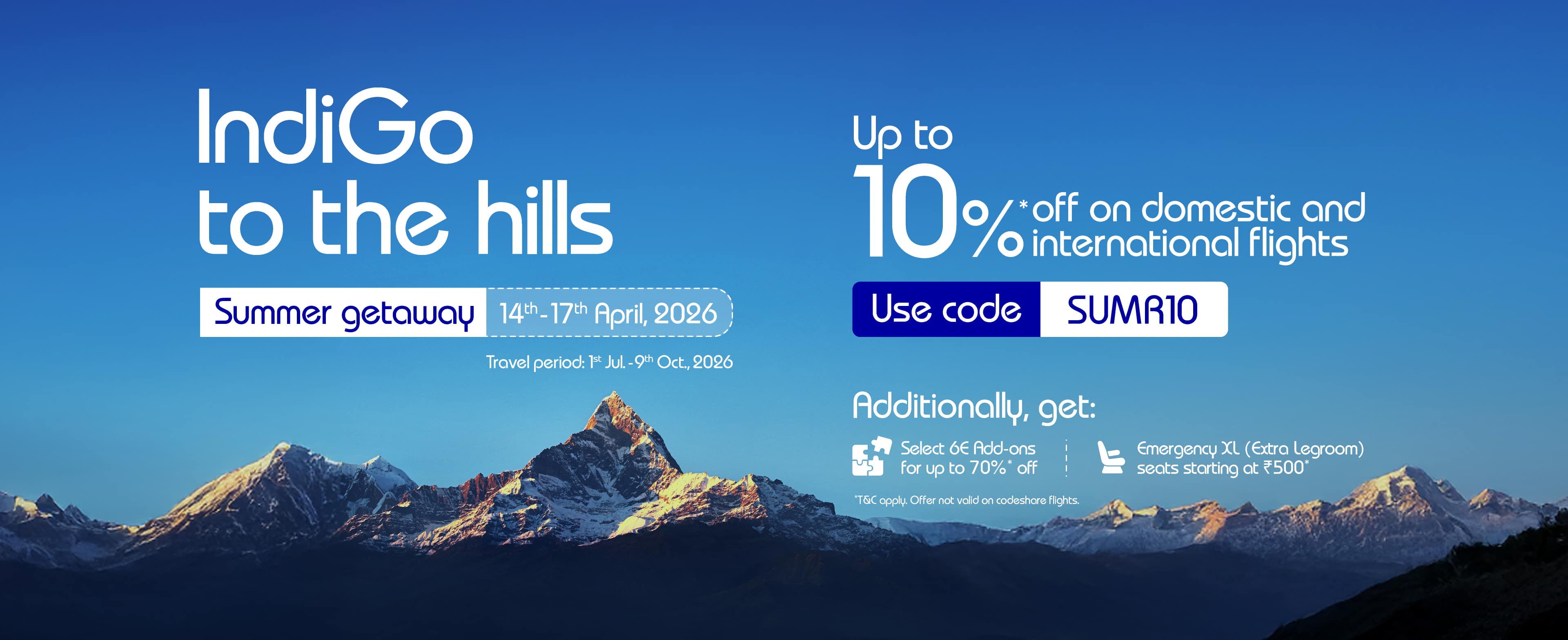 1. InterGlobe Aviation Limited (“IndiGo”), offers to its customers special discounts of up to 10% on base fare on select domestic and select international sectors and discounted Add-Ons (as defined below) for flight bookings made through IndiGo website (www.goindigo.in) or IndiGo mobile app (whether Android or iOS) or IndiGo 6ESkai or IndiGo WhatsApp (+917065145858) or through select Travel Partner’s website/mobile app. This offer is valid from 00:01 hours on April 14, 2026, to 23:59 hours on April 17, 2026 (“Offer Period”) for travel scheduled between July 1, 2026, and October 9, 2026 (“Offer”).